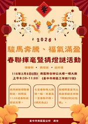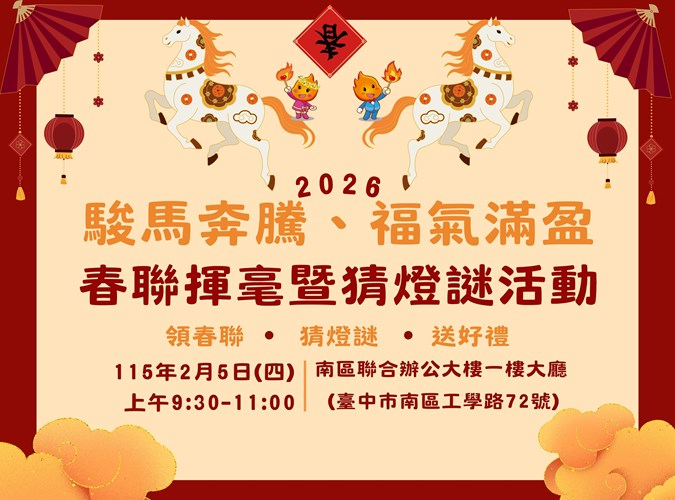 本所於114年2月5日辦理「2026駿馬奔騰、福氣滿盈」春聯揮毫暨猜燈謎活動,歡迎踴躍參加! 臺中市南區區公所‧人文課 2026-01-08 旨揭活動謹訂於115年2月5日(星期四)上午9時30分至11時50分,假本區聯合辦公大樓1樓大廳辦理,敬邀蒞臨增添喜氣。 活動内容:邀請9位書法名家現場揮毫,民眾可免費排隊領 取春聯。 依序排隊領取春聯紙,時間至11時或春聯紙發送完畢。 每人限領一幅七言春聯,年畫及一言春聯則不限。 致贈限量臺灣火柴故事館吉祥物「阿柴(財)紅包袋」。