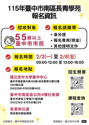 115年臺中市南區長青學苑招生簡章 臺中市南區區公所‧社會課 2026-01-26 ★115年台中市南區長青學苑招生簡章★ 115年南區長青學苑課程簡章及報名資訊已出爐啦! 本年度暫不提供紙本招生簡章, 歡迎大家下載電子簡章, 一起來看看有哪些精彩課程吧! ※欲報名各里之課程,建議先行聯絡里辦公室確認有無收件、收件地址及時間※