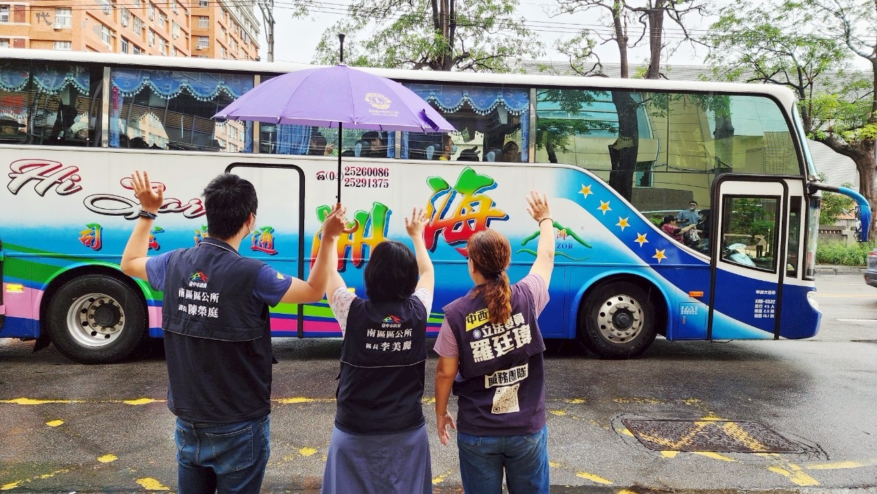 台中市南區區公所李美麗區長與人文課陳榮庭課長冒雨向從軍役男依依揮手送別