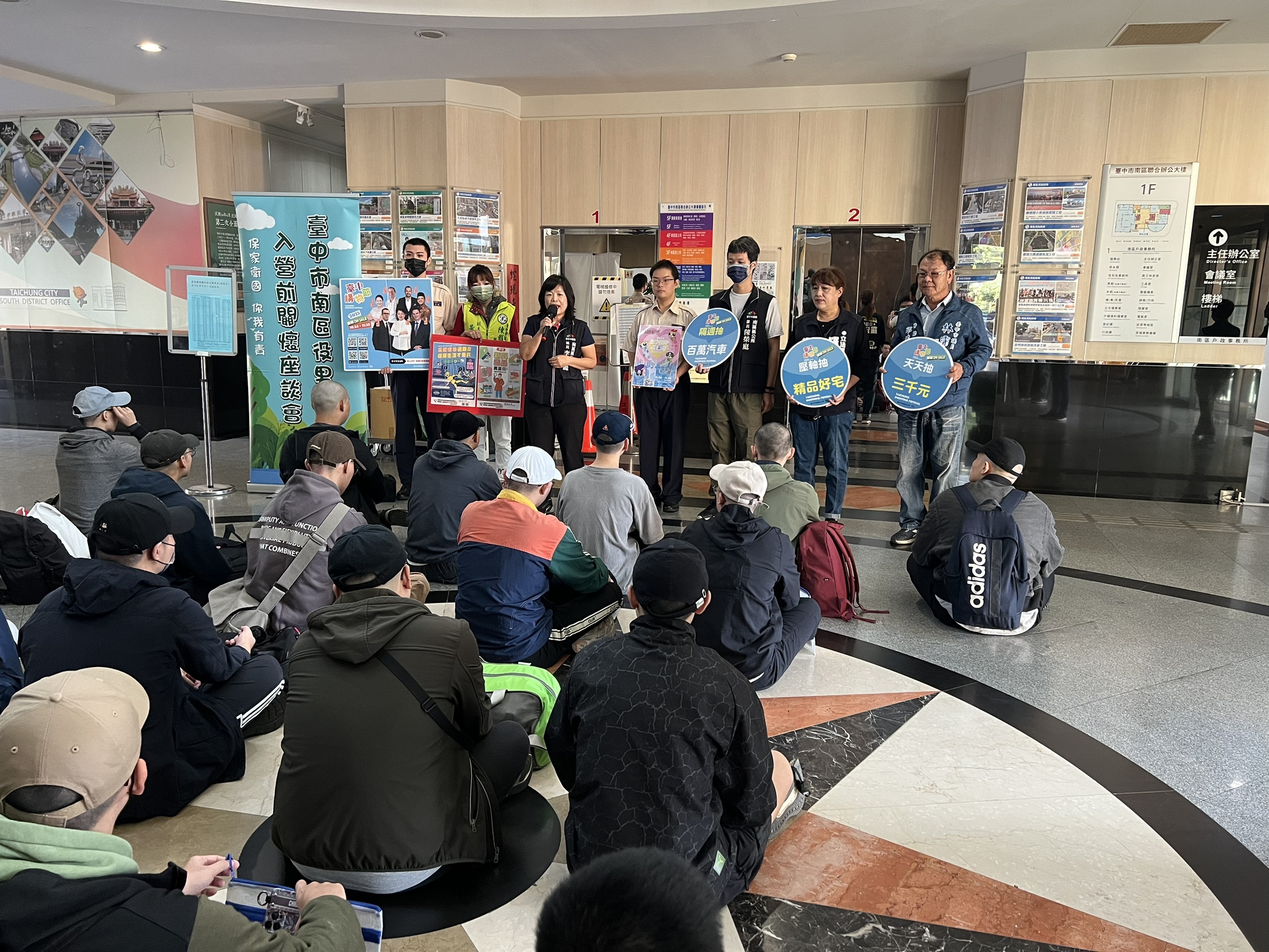 台中市南區區公所李美麗區長與人文課陳榮庭課長對從軍役男政令宣導如反詐騙及宣傳台中購物節等活動
