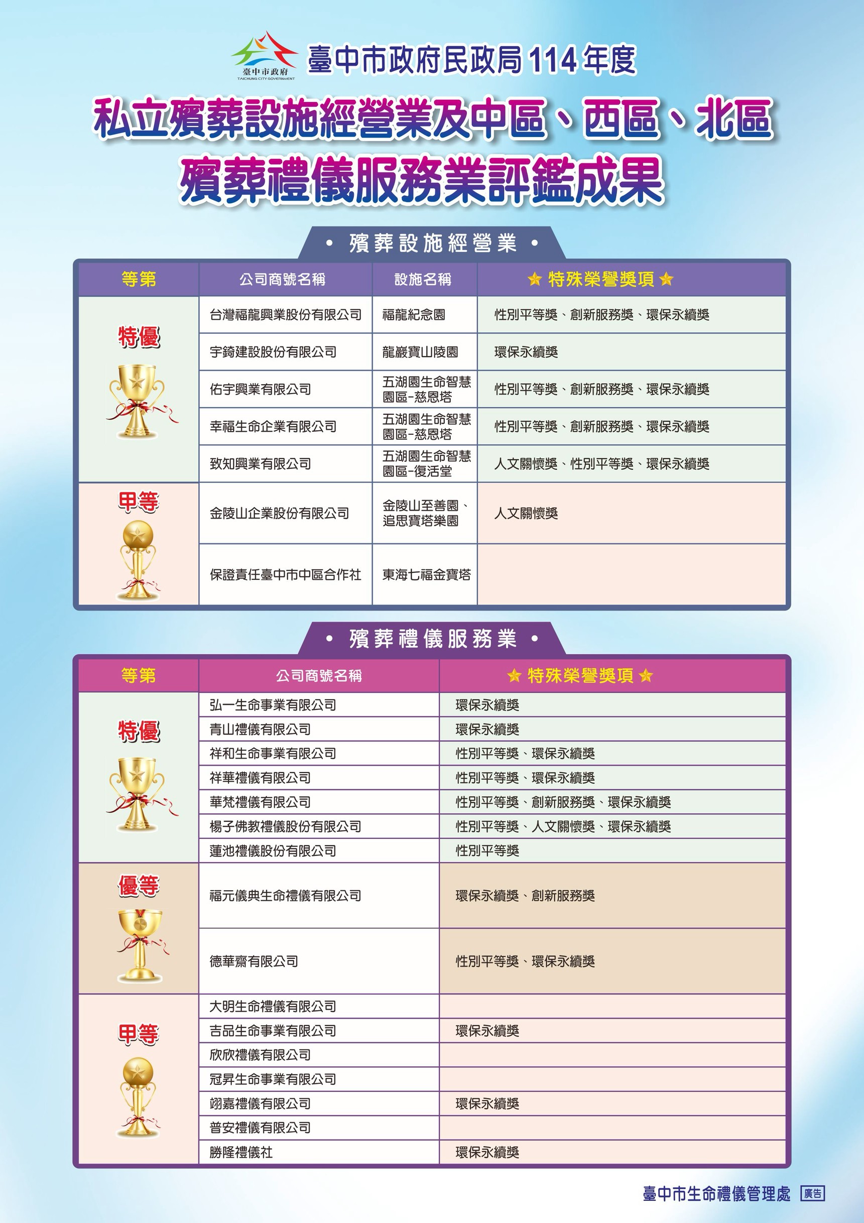 臺中市政府民政局114年度殯葬服務業評鑑成果