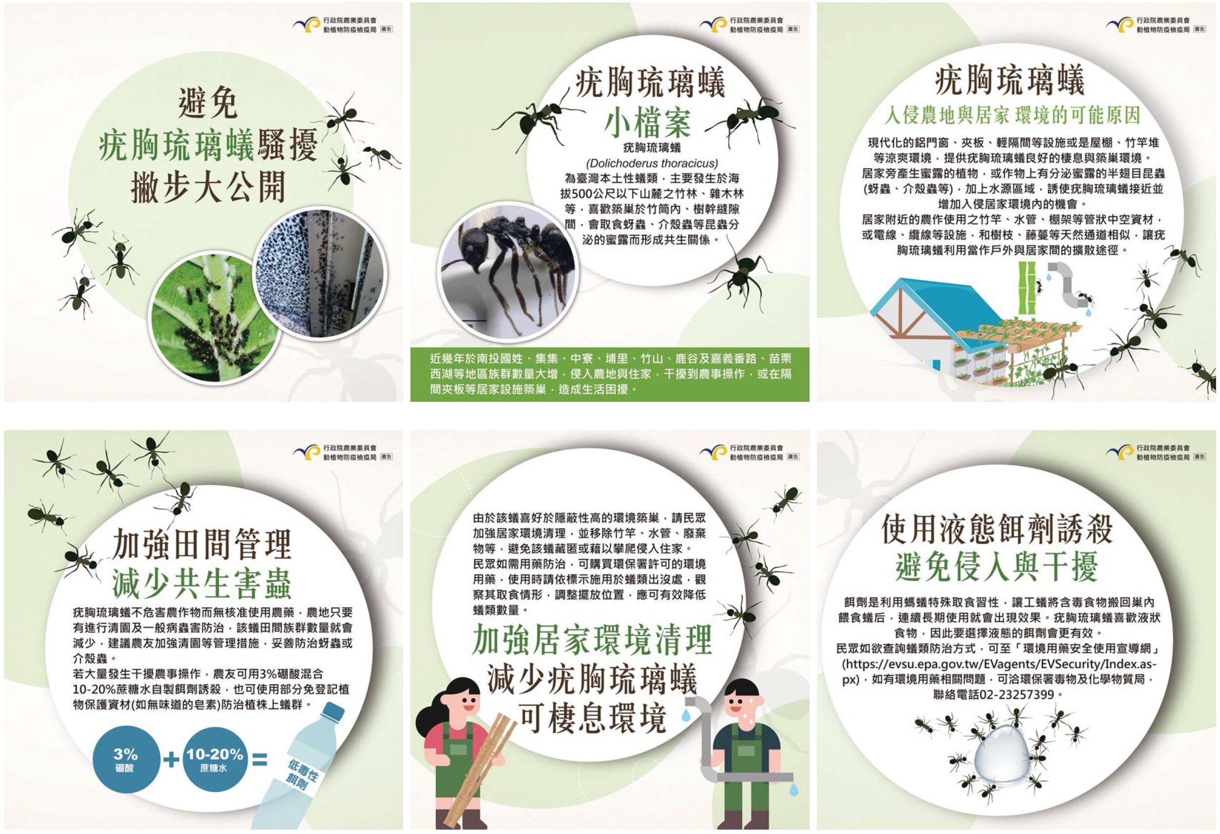加強源頭管理-疣胸琉璃蟻不聚集 防治琉璃蟻應以環境整理和餌劑防治為主,避免使用殺蟲劑,以免擴大蟻群。 具體方法包括清除孳生源(如枯枝、竹管),並使用低毒性餌劑(如3%硼砂+10-20%糖水)誘引工蟻回巢。