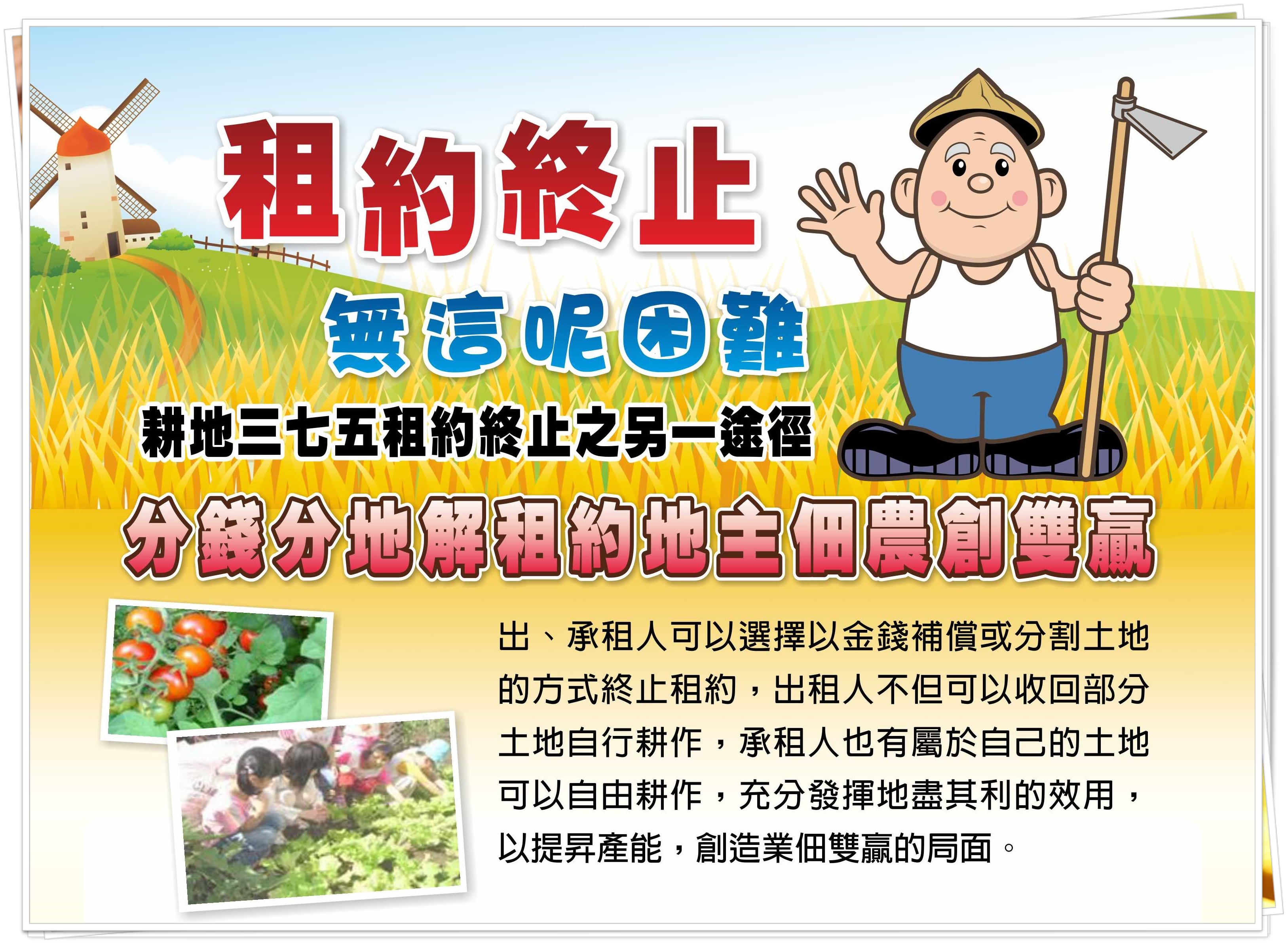 耕地三七五減租條例自民國40年公布施行,明定耕地租約一律以書面為之,租佃期間不得少於6年,地主非有法定原因,租約存續中不得任意主張終止租約以保障佃農權利,租約期滿時除地主得依法定要件申請收回自耕外,如佃農願繼續承租者,應予續訂租約;另租佃雙方如有爭議,均依耕地三七五減租條例相關規定辦理。另為配合「放寬農地農有、落實農地農用」政策之調整,農業發展條例第20條規定,自89年1月28日以後所訂立之農業用地租賃不適用耕地三七五減租條例之規定,而回歸契約自由原則。(資料來源:內政部網站)