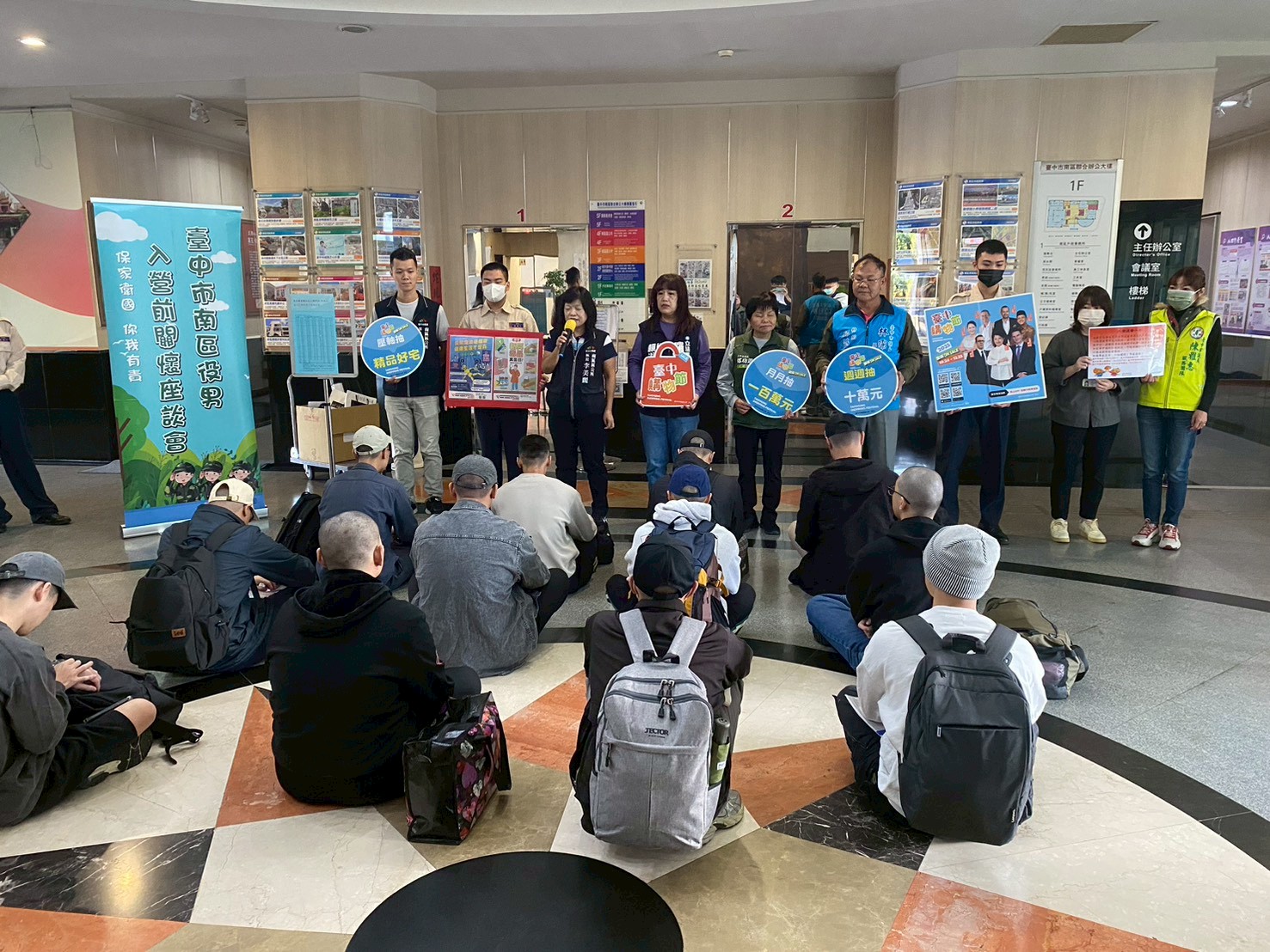 台中市南區區公所李美麗區長與人文課陳榮庭課長對從軍役男政令宣導如反詐騙及宣傳台中購物節及台中耶誕城與年終跨年等活動