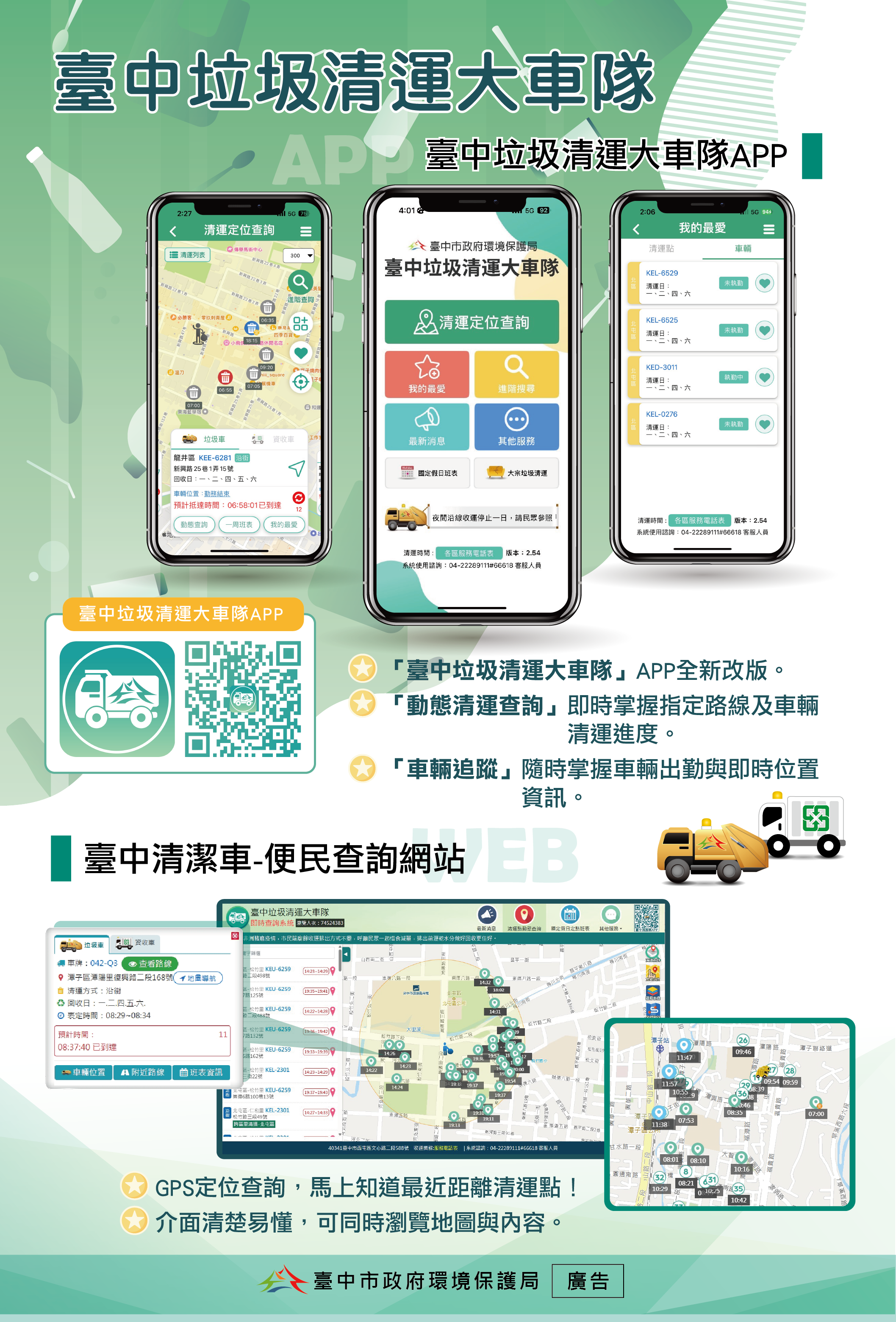 大家也可以下載「台中垃圾清運大車隊」APP,查詢垃圾車時間、地點,還能設定提醒!📍📱