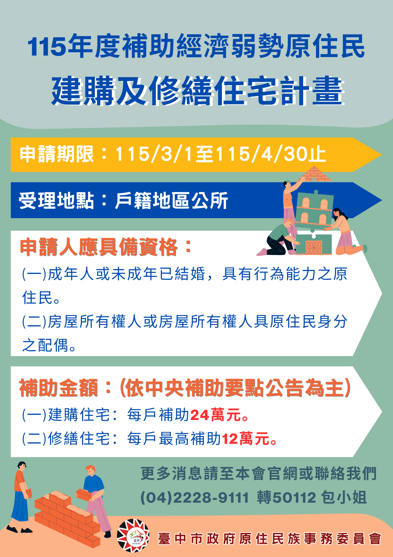 115年度「補助經濟弱勢原住民建購及修繕住宅」即日起受理申請至115年4月30日止