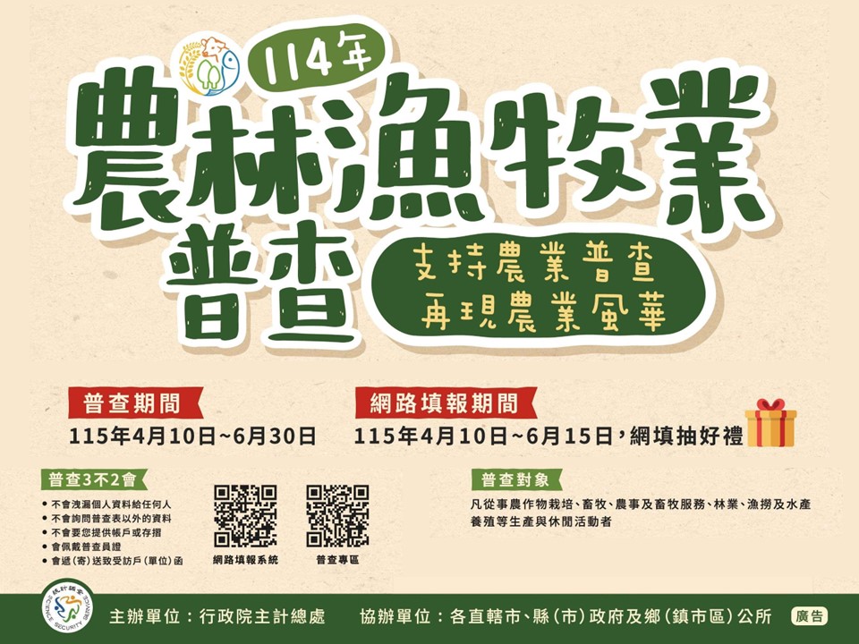> 114年農林漁牧普查期間自115年4月10日至6月30日