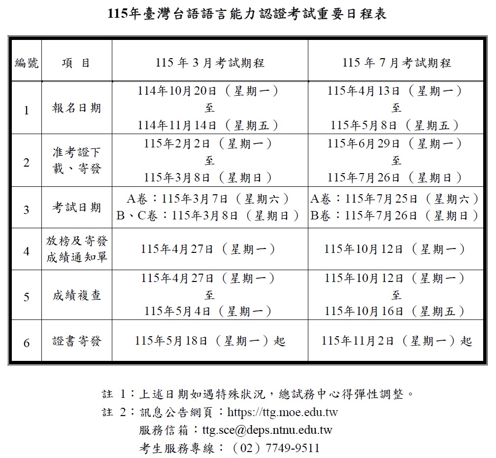 一、教育部為鼓勵全民學習臺灣台語,特舉辦旨揭認證考試。有關本次考試重要日程表詳見考試官網(https://ttg.moe.edu.tw)。